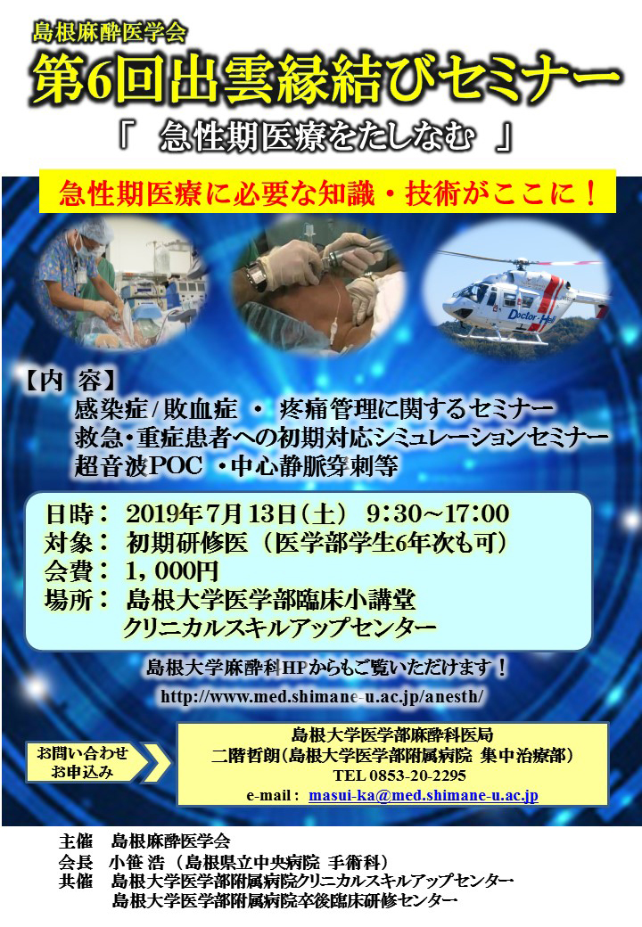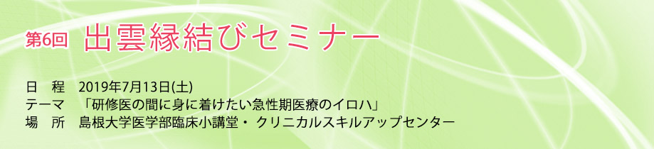 研修医の皆さん 「第6回出雲縁結びセミナー」を開催いたします! 明日からの臨床実践に向けて、シミュレーションを通しベーシックな手技の獲得をめざします。 リフレッシュを兼ね、お気軽にご参加ください。