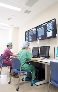 当院の手術中の麻酔・全身管理の特徴として、手術による患者さんへのストレスを軽減させるために、ストレスが加わることを遮断できる神経ブロック (硬膜外麻酔、脊髄くも膜下麻酔、超音波ガイド下末梢神経ブロック)を全身麻酔に併用する方法を重視していることが挙げられます。年々麻酔科管理症例は増加していますが、麻酔科による4000例/年以上の麻酔・周術期全身管理のうち、約半数に硬膜外麻酔、脊髄くも膜下麻酔、超音波ガイド下末梢神経ブロックを併用いたしています。すべての手術で、専任の麻酔科医が患者さんの手術中の全身管理をするとともに、各手術室の全身管理モニターをセントラルモニター室と直結させ、麻酔科医を統括する麻酔科医のリーダーがセントラルモニターを看視することで安全な麻酔・全身管理を行っております。