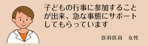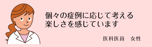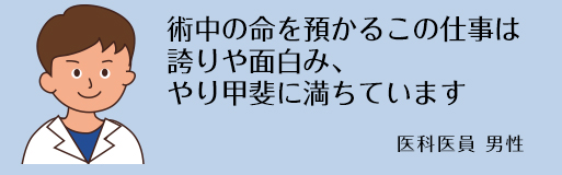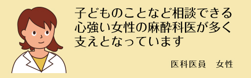 私は今保育園の子どもを持ちながら麻酔科医として働いています。子どもを持ちながら仕事を続けることは時間的なことを含め様々な制約があり大変ですが勤務シフトを考慮してもらえるので助かっています。夕方手術が遅くなったときや子の急な病気のときなど迷惑をかけてしまうことも多いのですが、カバーしてくださる医局の先生方のおかげで勤務を続けることができています。また、島根大学の麻酔科には仕事のことだけでなく子どものことなど相談できる心強い女性の麻酔科医も多いので支えとなっています。毎日あっという間に過ぎていく日々ですが、仕事・子育ての両立が出来るよう頑張っています。一緒に充実した日々を過ごしてみませんか?