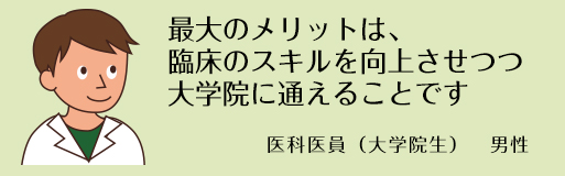 現在、麻酔科医として臨床の現場で働きながら大学院に通っています。大学院というと一般的には堅苦しく難しい印象がある上に、臨床から一定期間離れてしまうため敬遠されがちです。しかし、麻酔科では教授をはじめ上級医の先生方と毎月カンファレンスを行い、実験手法を検討しながら自分の成長に合わせ実験を進めていけます。加えて、海外での学会発表や統計セミナーにも参加させてもらえるので、臨床とはまた違った経験ができ医師としてレベルアップ出来ます。また当科の最大のメリットは、臨床のスキルを向上させつつ大学院に通えることです。月に3-4回、平日に実験日をいただき実験をするため、それ以外の日は臨床の現場で今まで通り経験が積めます。みさなん!臨床医として、研究者として一緒に頑張っていきましょう!!