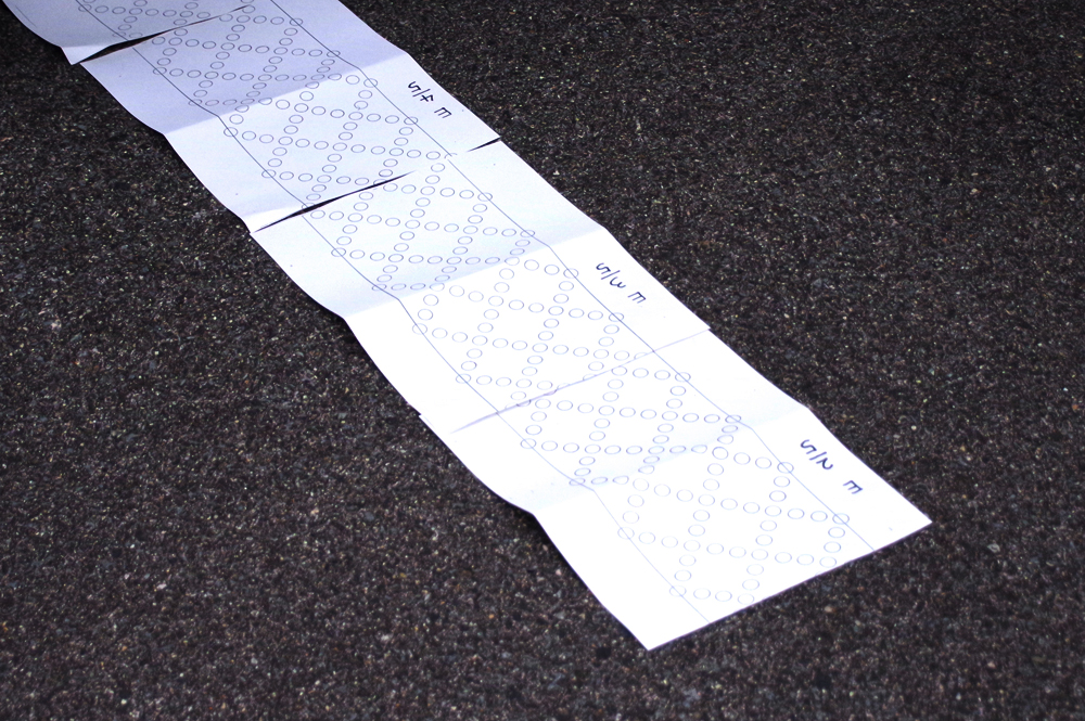 貼っているのは型紙です。穴を開ける位置てあります。竹の細い方を上にし、節にあわせて位置決めをしてあります。