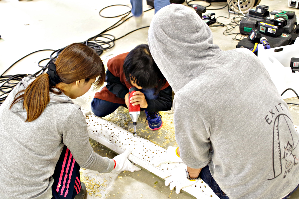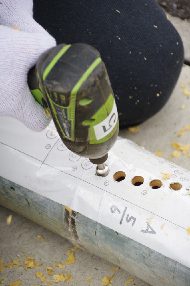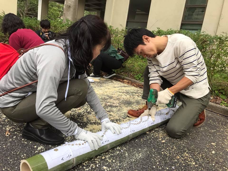 竹の両端を支えてインパクトドライバーを竹に垂直にあてて穴をリズミカルに開けていきます。
