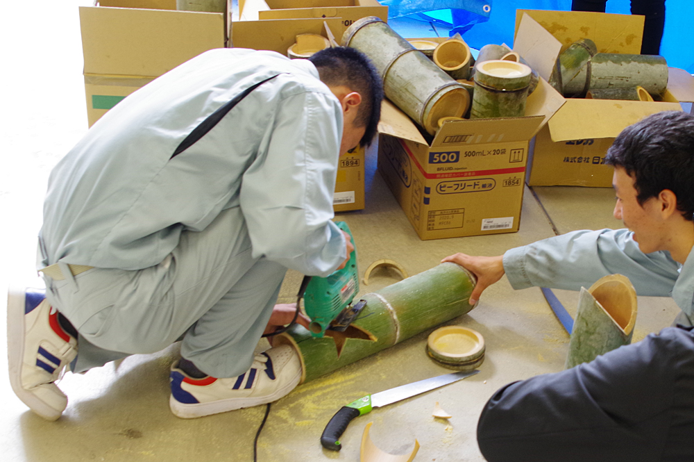 中にLEDの明かりを入れるための大事な作業です。竹をきちんと支え、長い金属の棒を使用して突いて中を壊していく、とても力のいる作業です。