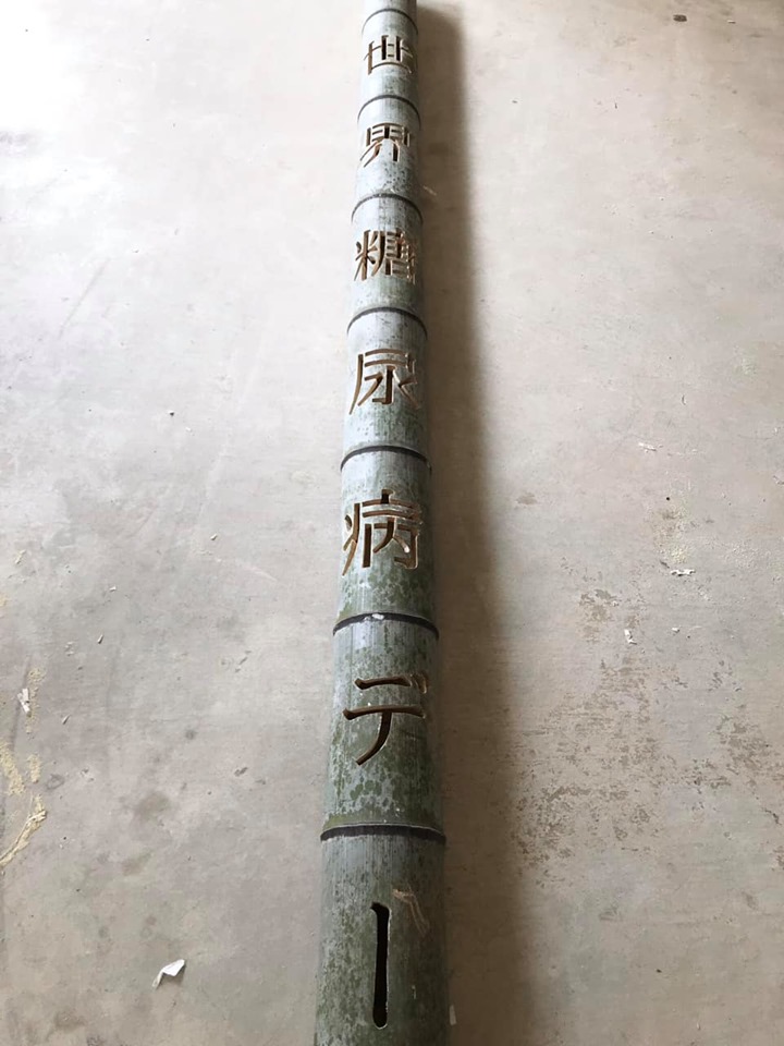 「世界糖尿病デー」の文字は、私たちの師匠、三木さんの作です。明朝体で、文字の「とめ」や「はね」も綺麗に掘られています。竹のつなぎ目を残し、しっかりデザインされている文字は芸術的ですね。