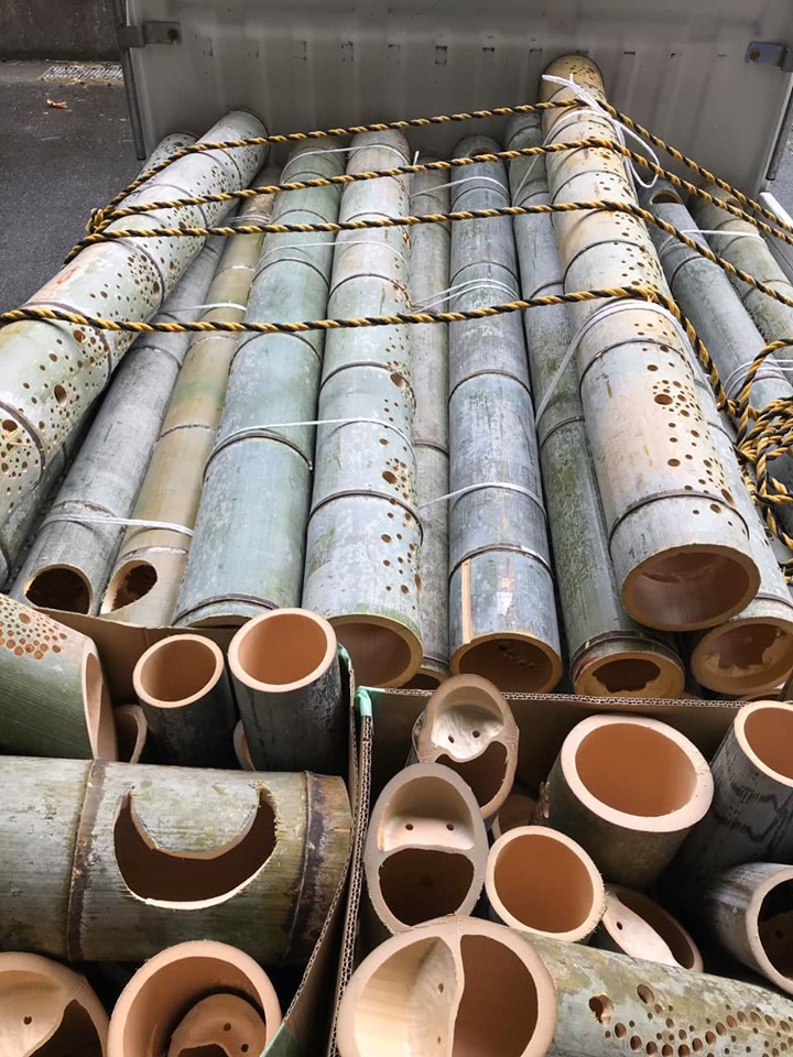 無事に、竹あかりづくりが完成し、トラックに積み込みました。切って短くなったものも、竹あかりとして、使用しています。今年は、新たな試みの、笑顔のあるデザインがありますね。