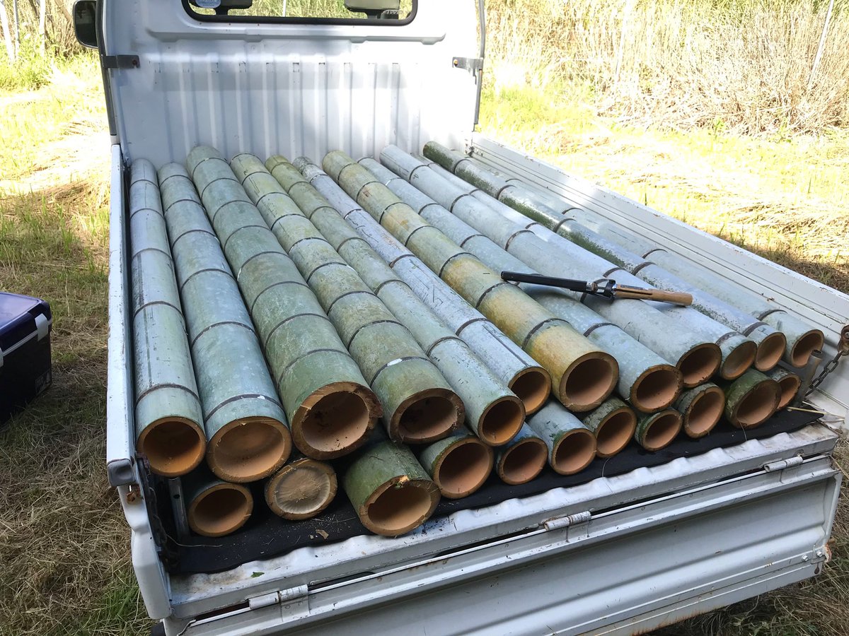みんなで一生懸命作業し、ノコギリや鉈(なた)を使って無事に竹を切り出しました。長さをそろえてから、軽トラックに積み込みました。
