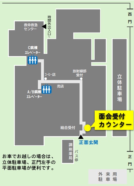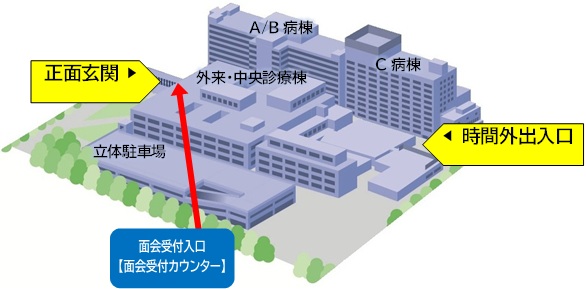 来院されましたら、正面玄関横の「面会受付カウンター」で受付票の記入をお願いいたします。(正面玄関は19:15に施錠しますので、それまでに退館してください)