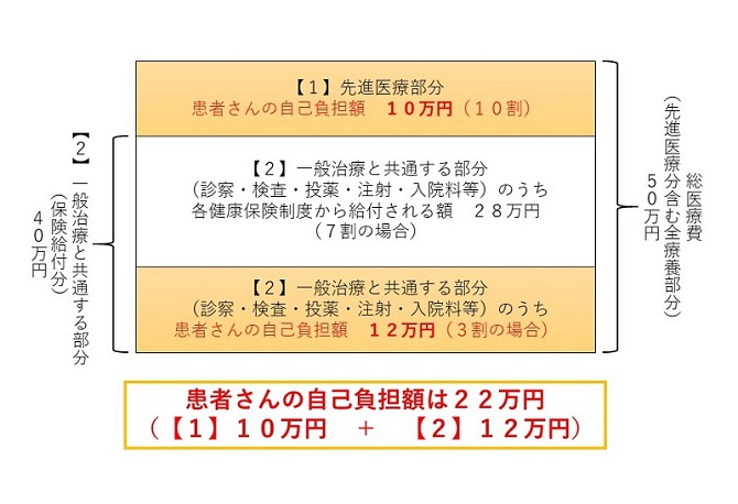例:総医療費50万円、うち【1】先進医療に係る費用が10万円、 【2】保険給付分(通常の診療と共通する部分)が40万円だったケース (70歳未満の一般所得者の例) |