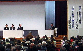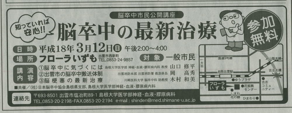 平成18年3月12日(日),出雲市一般市民を対象に「知っていれば安心 脳卒中の最新治療」のタイトルで,脳卒中市民公開講座をフローラ出雲にて開催しました。 (1)脳卒中に気づくには(島根大学医学部神経・血液・膠原病内科 山口修平),(2)出雲市の脳卒中搬送体制(出雲市消防本部 岡高秀),(3)脳梗塞の最新治療(川崎医科大学脳卒中科 木村和美)の3つの講演を行い,その後に質疑応答を行った。全体で2時間。 当日は,約480名の市民の参加を得た。質疑応答の中で,様々な脳卒中の後遺症への対処方法,薬の服用方法や注意点,脳卒中の初期症状,消防隊への連絡等について理解が深まったものと考えられる。 ![]() |