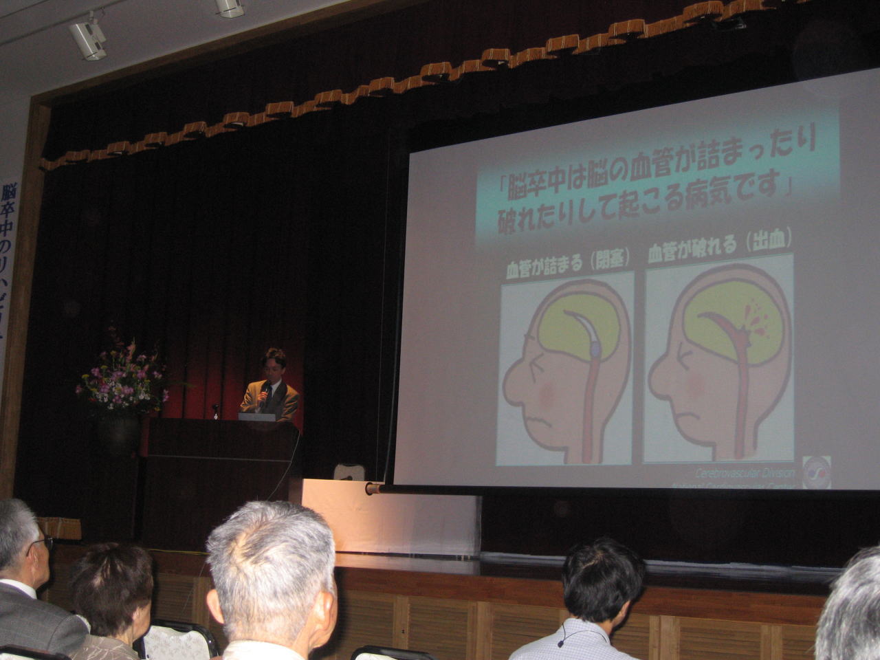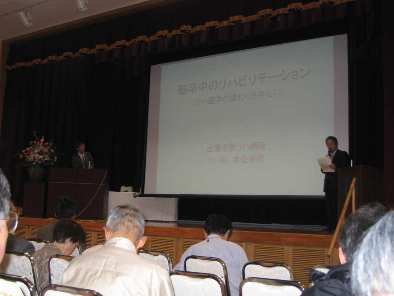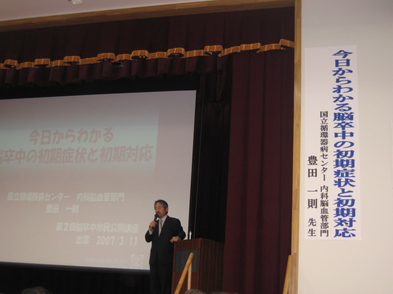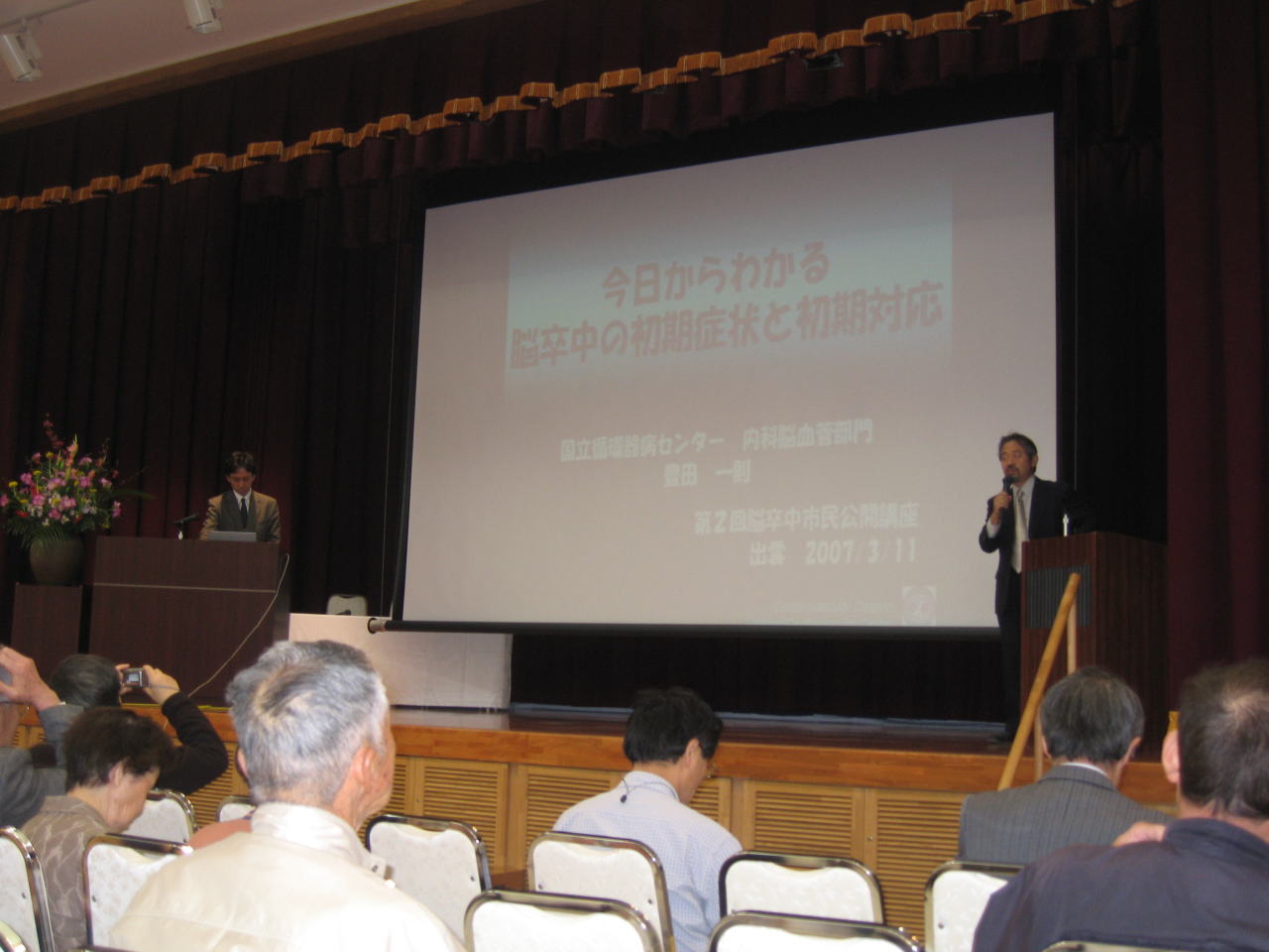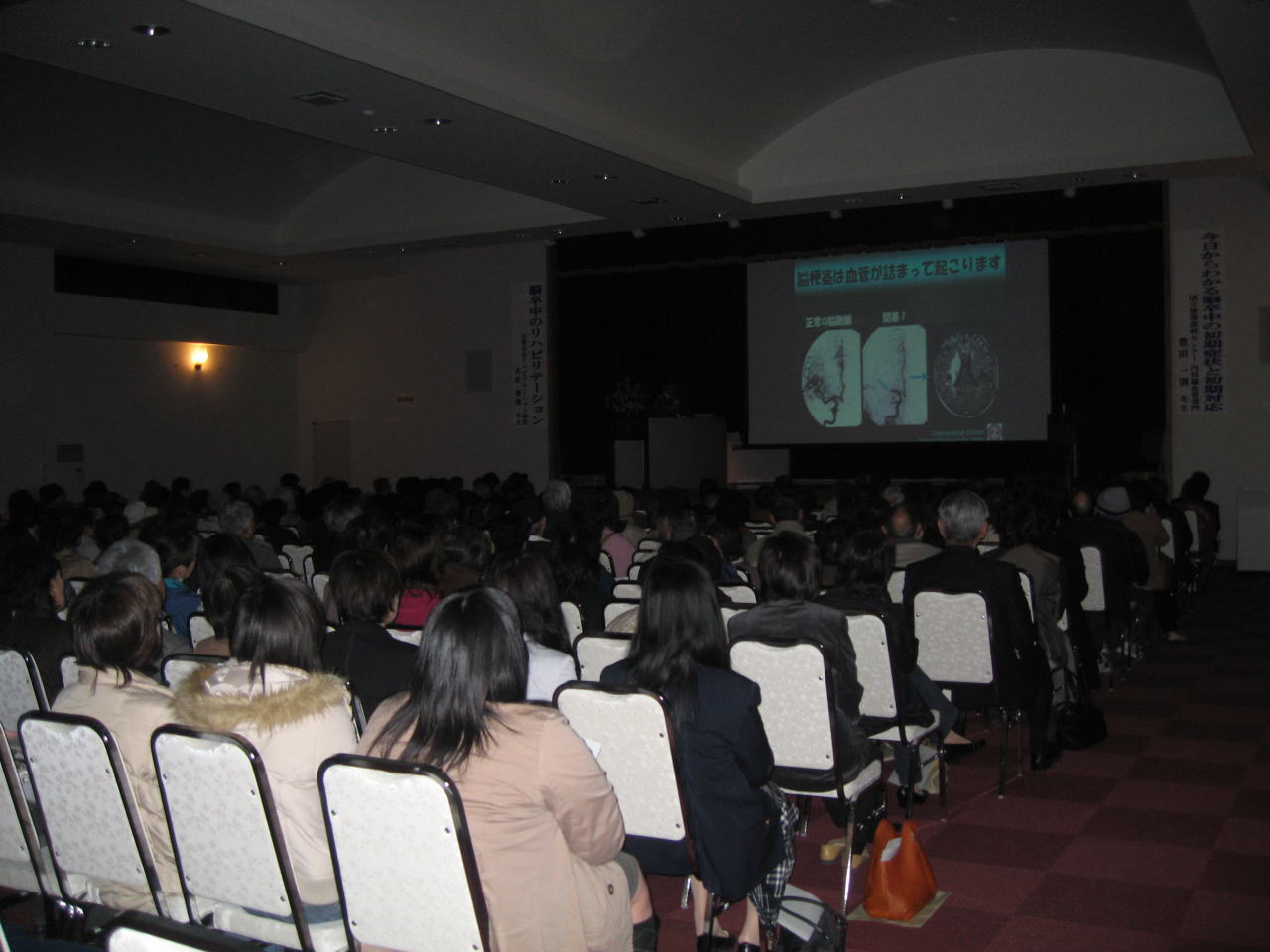 | 平成19年3月11日(日),出雲一般市民を対象に「脳卒中!どうしますか」のタイトルで,脳卒中市民公開講座をフローラいずもで開催した。 1.今日からわかる脳卒中初期症状と初期対応(国立循環器病センター内科脳血管部門 豊田一則) 2.脳卒中のリハビリテーション(出雲市民リハビリテーション病院 木佐俊郎) の2つの講演を行い,その後に20分ほどの時間で質疑応答を行った。当日は380名の市民参加を得た。 参加者の多くは中高齢者で脳卒中が身近な健康問題となっており,中には脳卒中患者も来聴し,質疑応答では切実な問題も話題となった。後で行ったアンケートの結果からは今回の講演会は極めて好評で,今後アンケートに書かれた要望も取り入れさらに充実した講演会にしたいと考えている。 |
