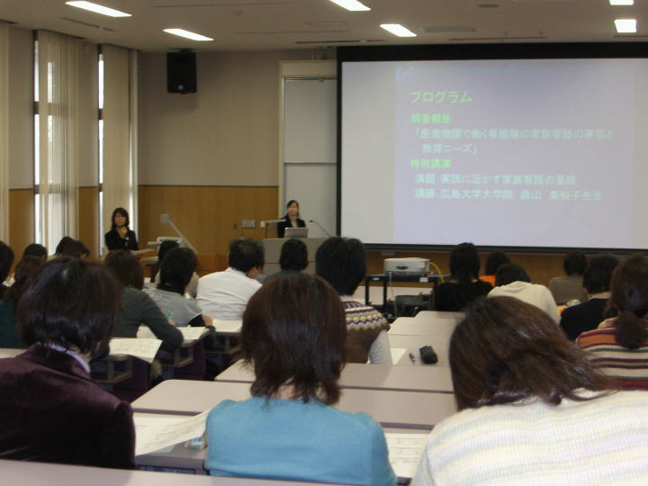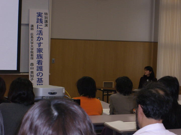 | 日時:平成19年1月13日(土) 13:30〜15:30 場所:島根大学医学部看護学科棟N11講義室 内容:○特別講演「実践に活かす家族看護の基礎」 森山美知子先生(広島大学大学院・教授) ○家族看護における看護職を対象とした調査報告「医療機関で働く看護職の家族看護への認識と教育ニーズ」 参加者:出雲市・外で勤務する看護師・保健師 67名(市外12名) 【概要】 公開講座:家族看護研修に初めて参加した看護職も多く,講演会後の感想には大学への教育的期待を求めている意見が寄せられた。参加者から事例が提示され,看護の実践方法を講師からわかりやすく解説して頂いたことで家族看護がイメージできたという感想が多かった。 調査報告:出雲市内3病院,外1病院に勤務する看護師376人を対象にアンケート実施し,有効回答者319人を分析した。主な結果では,家族看護に関心を持っている人は85.9%で,年代に関わらず家族看護への関心は高かった。この背景には以下の2つの要因が考えられた。@看護基礎教育で家族看護学の講義を受けた看護職は19.7%と少なく,卒業後家族看護の研修を受けた看護職も26.6%で研修に十分参加できていないこと。A家族の関わり方に78.1%の看護職が課題を抱えており,解決策としては病棟や院内の上司や同僚に相談することで対処している,等である。 ![]() |