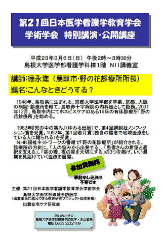 緩和ケア講座 第21回日本医学看護学教育学会学術学会 特別講演・公開講座 平成23年3月6日(日) 午後2時~2時30分 講師:徳永進 (鳥取市・野の花診療所所長) 題名:こんなときどうする? 2001年12月、鳥取市内にてホスピスケアのある19床の有床診療所「野の花診療所」を始める。1982年『死の中の笑み』(ゆみる出版)で、第4回講談社ノンフィクション賞を受賞。1992年、第1回若月賞(独自の信念で地域医療をしている人に贈られる)を受賞。NHK福祉ネットワークの番組で「野の花診療所」が紹介される。診療所の方針に、「人の悩みから出発する」、「患者さんの希望と選択を支える」、「昼の雲、夜の星を大切にする」の3つを掲げ、いい最期を見届けていく医療を展開している内容を紹介。学会員70名に加えて,出雲・松江・雲南等から120眼に市民が参加し,熱心に聴講・質問された。 ![]() |
