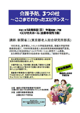 | 講演会日程: 「高齢者の健康増進の考え方」 平成22年8月27日(金) 13:00~15:00 今市元気交流館 「運動に関する学習と指導」 平成22年10月8日(金) 13:00~15:00 今市元気交流館 「栄養に関する栄養に関する学習と指導」 平成22年11月19日(金) 13:00~15:00 今市元気交流館 「高齢者の介護予防」 平成22年12月5日(金) 16:00~18:00 今市元気交流館 「野の花ホスピスだより」 平成23年3月6日(日) 12:00~16:00 島根大学医学部 対象者:一般市民 講座実施状況 介護予防講座 平成22年8月1日 今市元気交流館 体力・栄養評価