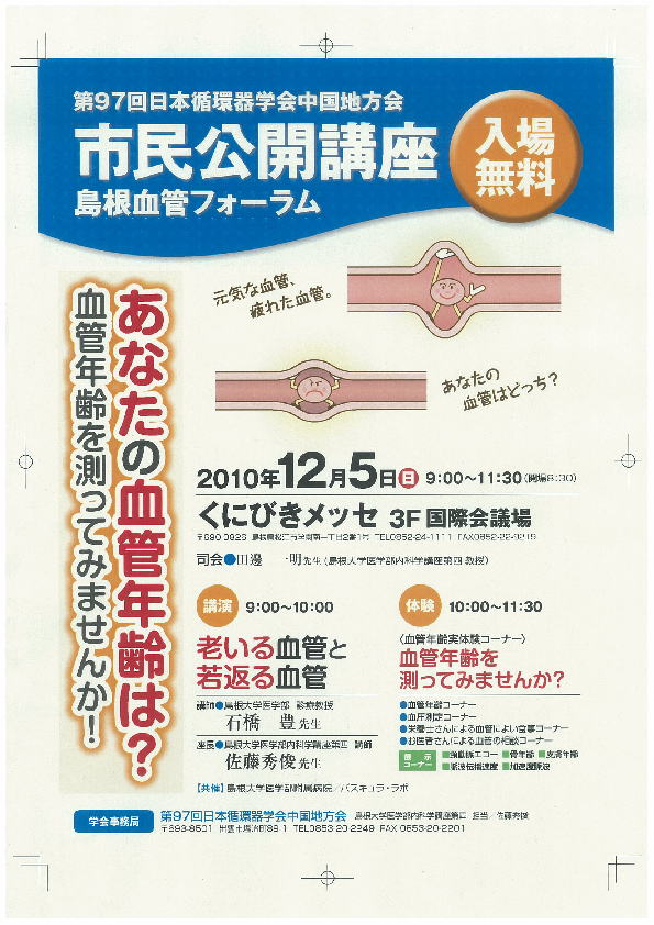 | 公開講座日程: 平成22年12月5日(日) 9:00~11:30 (会場 8:30) 場所: くにびきメッセ 3F国際会議場(松江市) プログラム: 講演 9:00~10:00 「老いる血管と若返る血管」 講師 島根大学医学部診療教授 石橋 豊 座長 島根大学医学部内科学講座第四 講師 佐藤 秀俊 体験 10:00~11:30 血管年齢実体験コーナー 血管年齢を測ってみませんか? 市民参加者:約80名 報告:市民対象の講演会と脈波などの実測を行い,市民から好評であった。 ![]() |