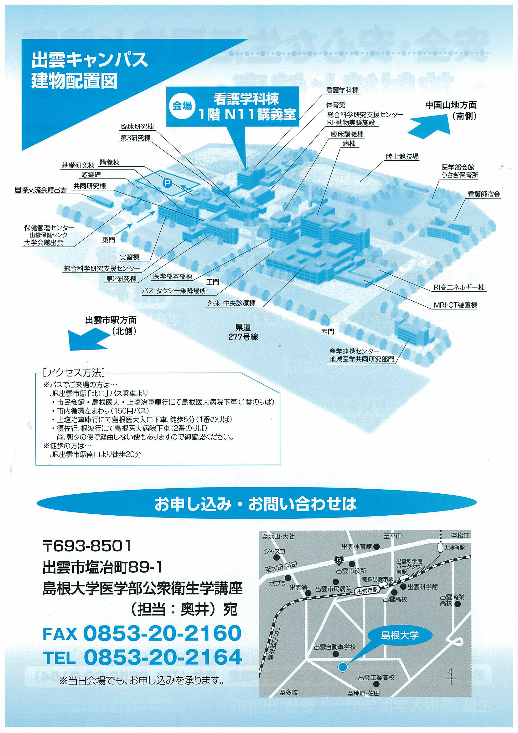 | 日 時:平成23年11月5日 (土) 13:30 ~ 15:30 会 場:島根大学医学部(出雲キャンパス) 看護学科棟1階N11講義室 対象者:一般市民 参加費:無 料 講座内容:平成23年3月11日福島第一原発の事故が発生しました。事故の際に飛散した放射性物質が未だに高濃度の 地域もあります。出雲市は島根原子力発電所から30kmの距離にあり,放射線による健康影響は,出雲市民に とって極めて重要な関心事となっています。 本市民公開講座では,福島第一原発事故の概要,放射線と健康,食品と健康について講演会を開催いたします。 みなさまのご参加をお待ちしております。 申込み,お問合せ先:島根大学医学部公衆衛生学教室 TEL:0853-20-2164 ※当日会場でも,お申し込みを承ります。 参加者数: 43名 報 告 環境研究成果を地域へ還元する一環として平成19年度より毎年1回、環境に関する市民公開講座を開催しています。 平成23年度は11月5日(土)に出雲キャンパスで「安全・安心な生活環境と健康~放射線と健康~」と題して、大学・行 政から環境に関わっている先生方による講演会を開催しました。参加者は43名で出雲市外からの参加もありました。 講演会の内容は、福島第一原発事故の概要、放射線と健康、食品と健康でした。質疑応答も活発に行われ、参加者 の関心の高さがうかがえました。 市民公開講座終了後、参加者にアンケートをお願いし、31名(回収率72.1%)から回答いただきました。今後希望する 講座内容として最も関心が高いのは、医学や健康に関する最新情報を知る講座をたくさん開いて欲しい等、健康管理の 最新知識に関するもので、次いで環境問題・エネルギー問題等の社会・時事問題に関するものでした。 このアンケートの要望・感想等を参考にし、本学の環境研究成果を地域へ還元するため、本市民公開講座を今後も継 続して開催していきます。 ![]() ![]() |