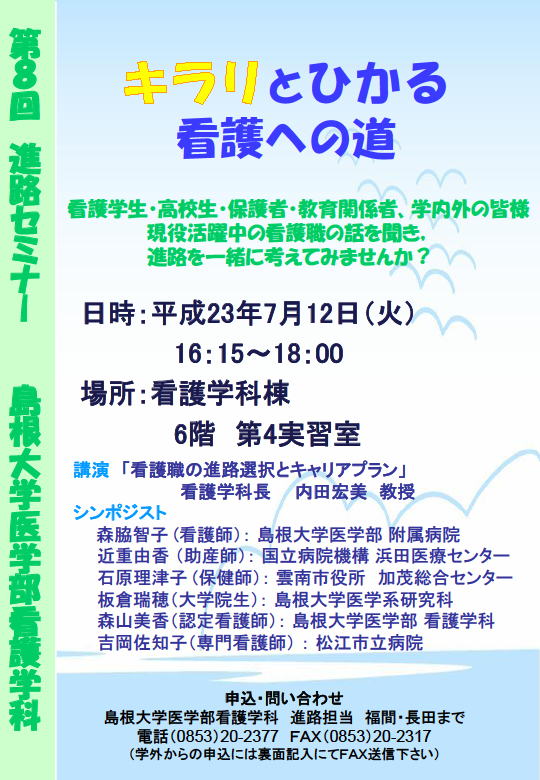 | 日 時:平成23年7月12日(火) 16:15~18:00 ![]() 会 場:島根大学医学部 看護学科棟 第4実習室 対象者:看護職を目指す学生 高校生 進路支援を行う教育者 保護者 一般市民 テーマ:「看護職の進路選択とキャリアプラン」 島根大学医学部 看護学科長 内田 宏美 事業内容 看護職を目指す看護学生,高校生,保護者等を 対象に看護職としてのキャリアプランについて考 え,今後の進路対策のための情報を提供し,今後 の進路対策等に活用してもらうことを目的とし た。具体的な内容は,保健師,助産師,看護師, 大学院生,認定看護師,専門看護師および本学看 護学科長を迎え, 仕事内容,役割,やりがい, 今後の展望,学生へのアドバイス等を行っていた だいた。 参加人数,参加者からの評価・意見,写真等はこちら |